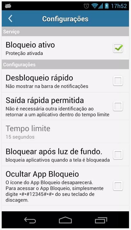 O App Lock também tem opções que impedem que um possivel invasor delete-o. Basta ir nas configurações avançadas e selecionar as seguintes opções: ”Config.” (impede que o App Lock seja desinstalado) e ”Geren. Tarefas” (impede que o App Lock seja desligado).