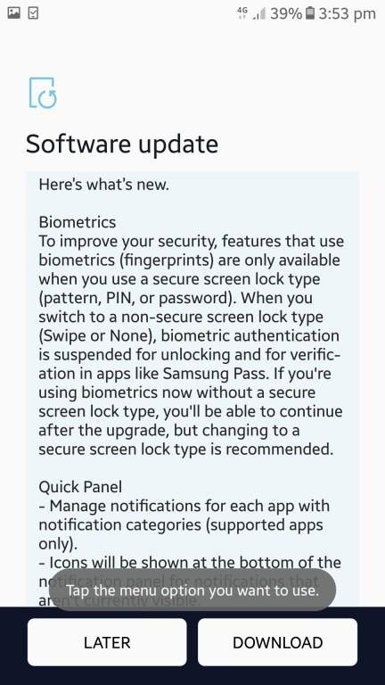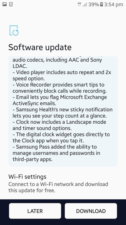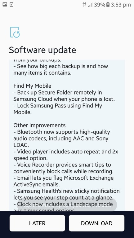 A atualização pesa cerca de 1040 MB, sendo necessária uma boa conexão de internet e pelo menos 50% de bateria no aparelho, a fim de garantir uma instalação segura. Além disso, a novidade conta com o Samsung Experience 9.5, trazendo muitas melhorias de interface e segurança na tela inicial, Smart View, Samsung Cloud e muito mais.