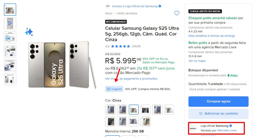 Para garantir o seu Galaxy S25 Ultra com o menor preço do Brasil, basta seguir nossas dicas. Primeiro de tudo, crie ou entre em uma conta válida no Mercado Livre. Depois, acesse o link promocional abaixo e selecione o cupom de 10% do produto em baixo do preço. Em seguida, selecione PIX como forma de pagamento para não perder o negócio!