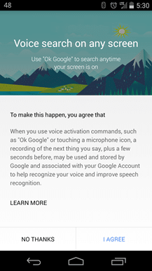 Outra melhoria em relação ao Google Now é o comando “OK Google”, que agora pode ser ativado com o comando em qualquer tela do aparelho, até mesmo na tela de bloqueio, com isso acessar as pesquisas pode ser uma tarefa muito mais rápida, porém essa configuração também não vem ativada, você terá que ir em configurações e selecionar as opções sobre essa função.