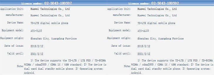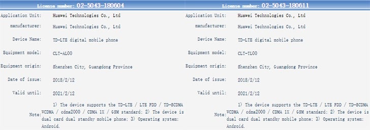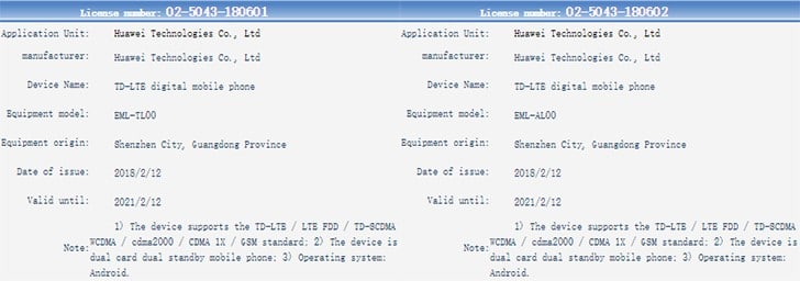Os dois smartphones  foram submetidos para licenciamento, com os nomes dos códigos encurtados em três letras – EML e CLT. Esses dispositivos serão testados para compatibilidade GSM e CDMA, a fim de poderem ser lançados na China.
