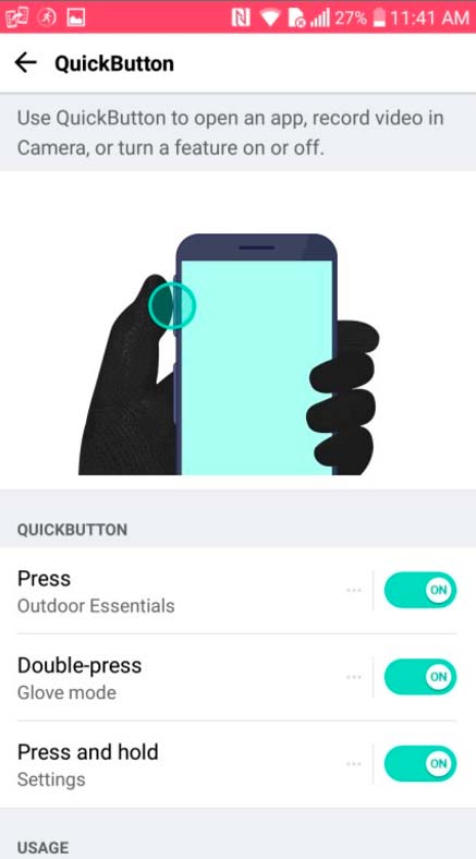 O aparelho ainda possui um botão de atalho chamado de QuickButton que facilita para acessar o aplicativo Outdoor Essentials, sendo que ele tem funções com contador de distancias, calorias, informações meteorológicas e abrir a lanterna, entre outros.