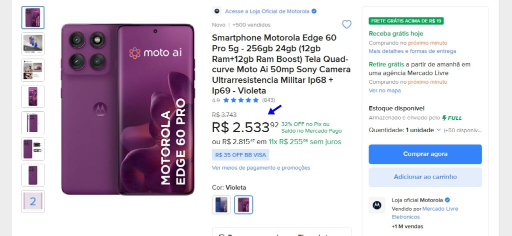 Um dos celulares mais bonitos e completos de 2025, o Motorola Edge 60 Pro está com um preço super atraente nesta quinta-feira (16). O modelo chegou aqui no Brasil com um preço inicial sugerido de R$ 3.999. No entanto, aparece agora com um preço matador na loja oficial da Motorola dentro do Mercado Livre saindo a partir de R$ 2.533!