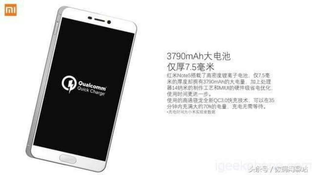 A bateria do Redmi Note 5 pode ter sofrido uma redução, caindo de 4.100mAh do Redmi Note 4, para 3.790mAh da versão 5. O motivo da redução seria para manter a espessura de 7,5 mm do aparelho, que ainda contará com a tecnologia QuickCharge 3.0, com USB Tipo-C.