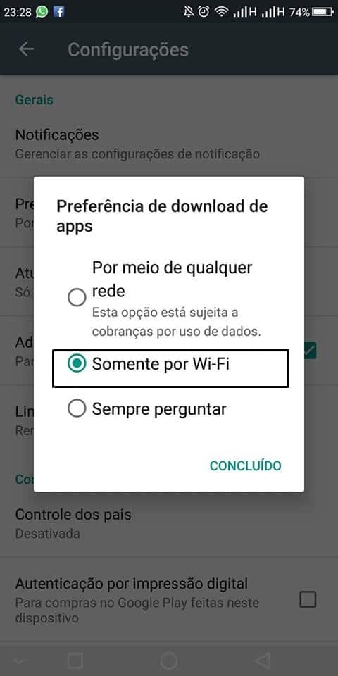 Ao fazer isso, o download aguardará até você se conectar ao Wi-Fi antes de iniciar o processo de instalação no dispositivo. Mas cuidado: caso você decida ter aplicativos baixados em qualquer rede, o processo deve começar imediatamente, mesmo que não haja sinal de Wi-Fi por perto.