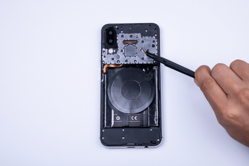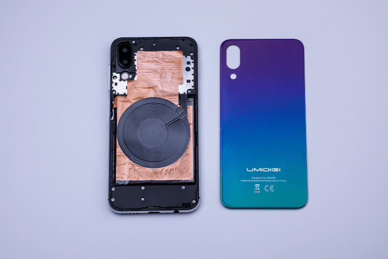 Como você pode ver, o selante foi aplicado, mas com a ajuda das ferramentas profissionais do iFixit, é bem fácil abrir o aparelho. Após abrir a tampa traseira, vemos que o dissipador de calor aplicado, bem como o módulo de carregamento sem fio. Vale lembrar que o One Pro suporta carregamento sem fio de 15W e NFC.